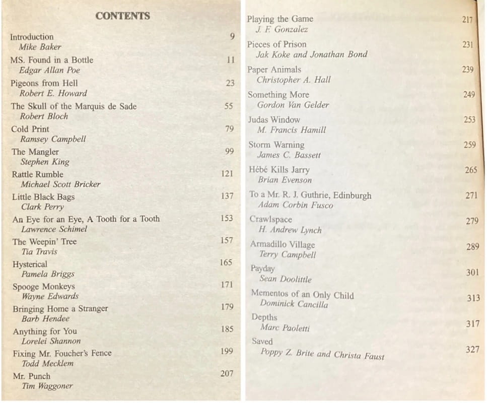 The collection also has stories by King, Ramsey Campbell, Robert Block, Poe, Michael Scott Bricker, Clark Perry, Lawrence Schimel, Tia Travis, Wayne Edwards, Pamela Briggs, Barb Hendee, Lorelei Shannon, Todd Mecklem, Marc Paoletti, Dominick Cancilla, Sean Doolittle, Terry Campbell, H. Andrew Lynch, Brian Evenson, James C. Basett, M. Francis Hamill, Gordon Gelder, Cristopher Hall, J. F. Gonzalez, Jak Koke & Jonathan Bond, Adam Fusco, Tim Waggoner, and Poppy Z. Brite & Christa Faust.